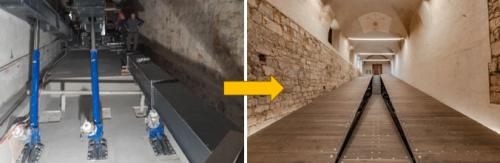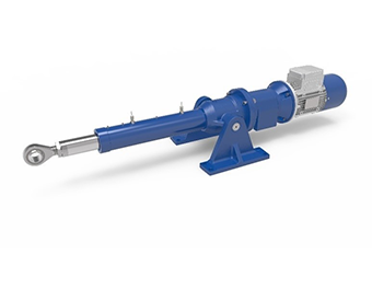 Example of use 3 pcs. of linear actuators-cylinders for raising and lowering platforms m=25 tons in the Kazemate-Ljubljana castle hall. The linear actuator is clamped with a joint support in the lower part and screws in the upper part, which allows free rotation around the axis. Motor power 7.5kW with brake and encoder, cylinder stroke 1800mm, lifting speed 5mm/s.